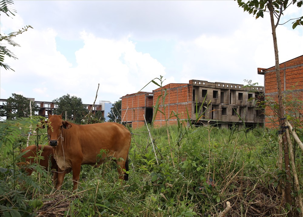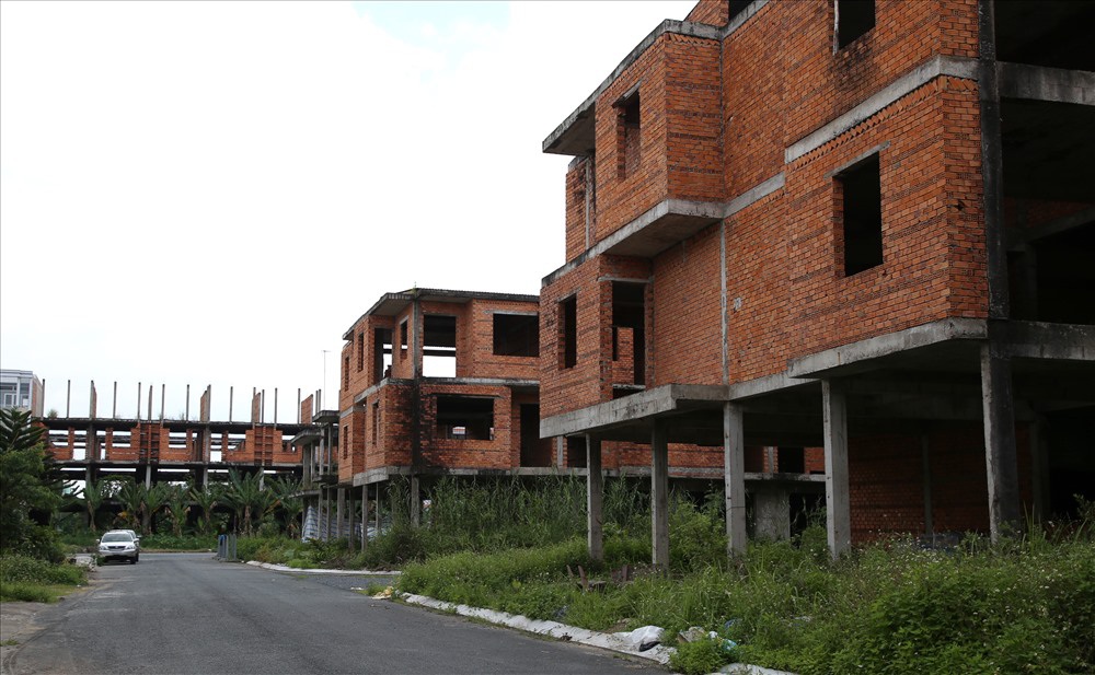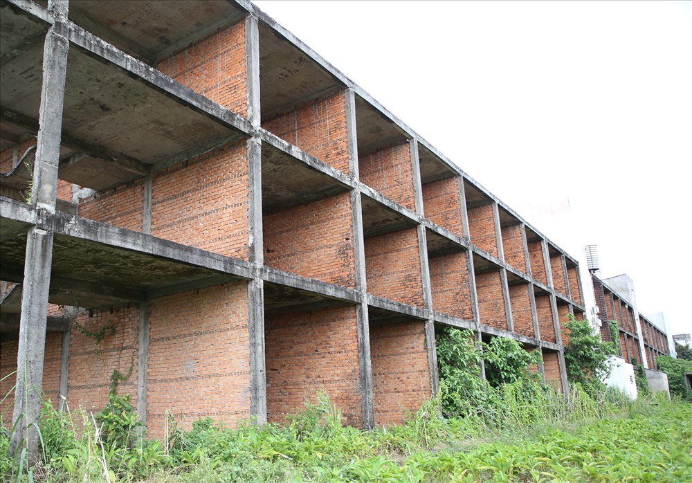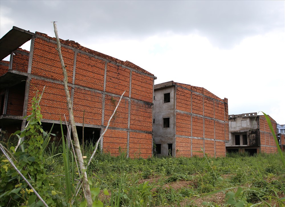 Chủ đầu tư khu dân cư chỉ mới xây dựng được phần thô, rồi để vậy phơi sương phơi nắng. Ảnh: H.Thơ.