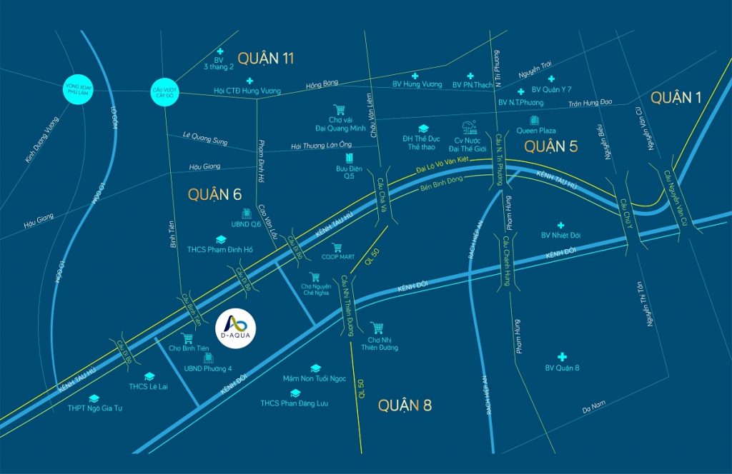 Dự án D-Aqua sở hữu vị trí đắc địa tại “trái tim” Q.8, ngay khu vực liền kề Q.1 với thời gian di chuyển vẻn vẹn 8 phút.