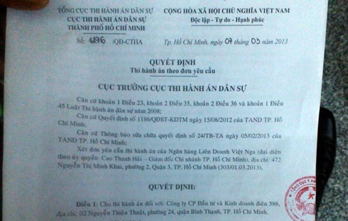Quyết định thi hành án của Cục thi hành án dân sự TP.HCM.