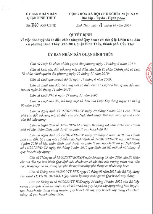 Quyết định số 3690/QĐ-UBND của UBND Q.Bình Thủy v/v điều chỉnh tổng thể Quy hoạch chi tiết tỷ lệ 1/500 Khu dân cư phường Bình Thủy