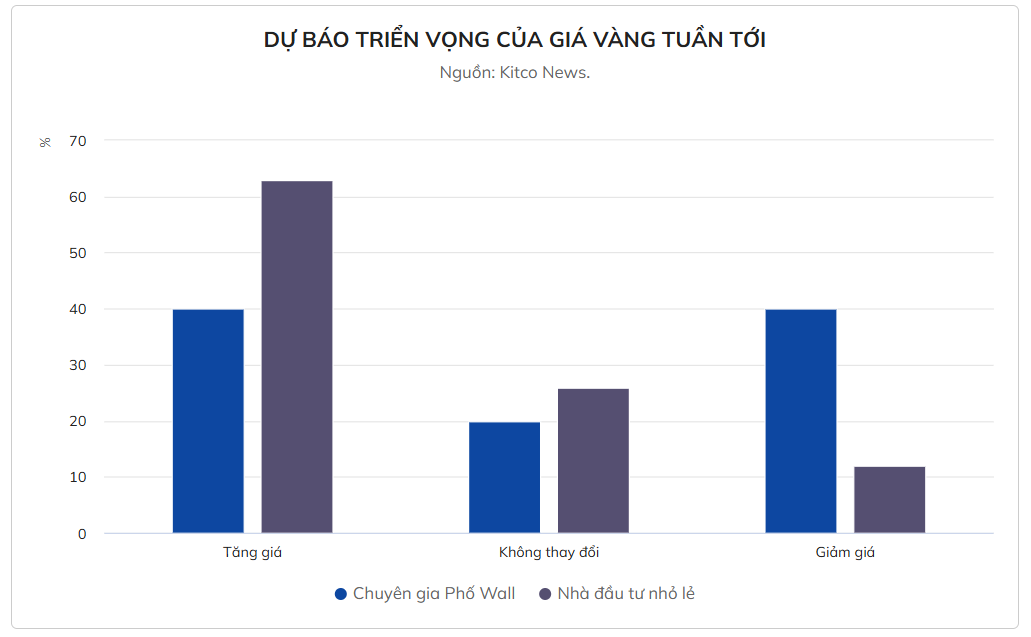 Có 6 chuyên gia (chiếm 40%) dự báo giá vàng sẽ tăng trong tuần tới, trong khi 6 người (chiếm 40%) cho rằng giá có thể giảm. Ba nhà phân tích còn lại, tương đương 20%, nhận định rủi ro tăng - giảm ở trạng thái cân bằng trong ngắn hạn.