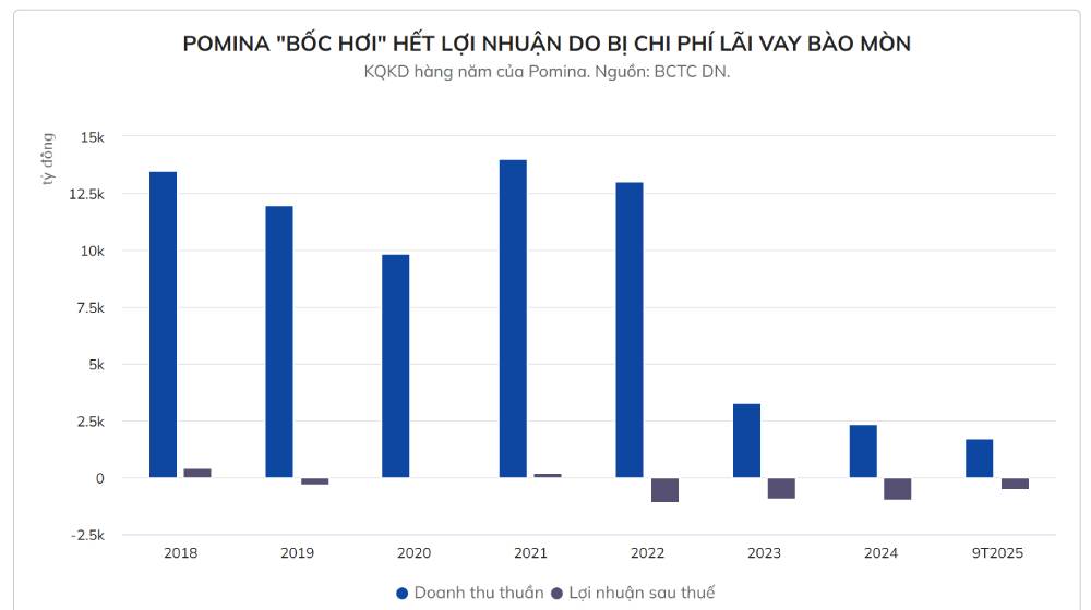 Pomina từng là một "biểu tượng" của ngành thép nội địa, nhưng kể từ năm 2022, doanh nghiệp này rơi vào chu kỳ suy kiệt kéo dài. Năm 2022, Pomina báo lỗ hơn 1.000 tỷ đồng, mức kỷ lục trong lịch sử hoạt động, và tiếp tục ghi nhận khoản lỗ xấp xỉ nghìn tỷ trong cả năm 2023 và 2024.