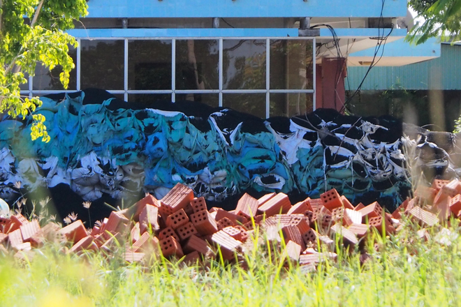 ... đến những cuộn cỏ nhân tạo phục vụ cho sân bóng cũng nằm bất động, hư hại.