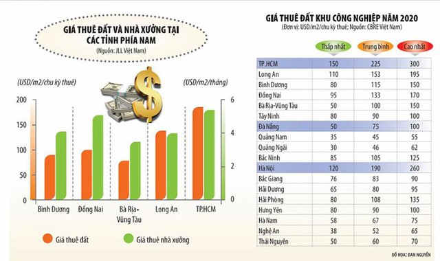 Còn JLL Việt Nam lý giải nhu cầu đất công nghiệp tăng cao là nhờ triển vọng Việt Nam sẽ trở thành trung tâm công nghiệp đầy hứa hẹn của khu vực. Hầu hết các chủ đầu tư tại các thị trường phía Nam đều ở “cửa trên” khi thương lượng và chào giá thuê đất tới mức kỷ lục 109 USD/m2/chu kỳ thuê trong quý IV/2020, tăng 7,9% so với cùng kỳ năm trước. Còn tại miền Bắc, các chủ đầu tư cũng duy trì lợi thế thương lượng lớn, bất chấp khủng hoảng dịch bệnh. Điều này đưa giá thuê đất công nghiệp lên đỉnh mới là 102 USD/m2/chu kỳ thuê trong quý III/2020, tăng 7,1%.