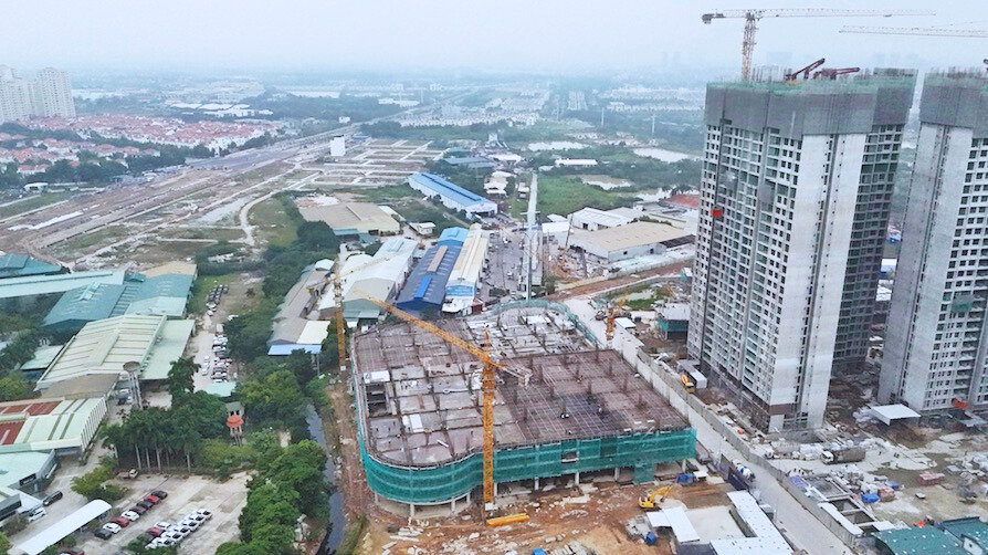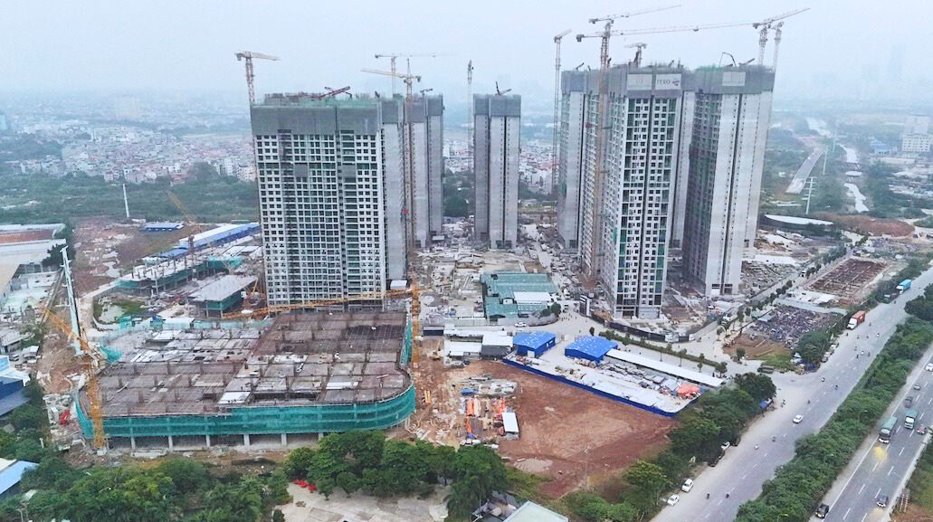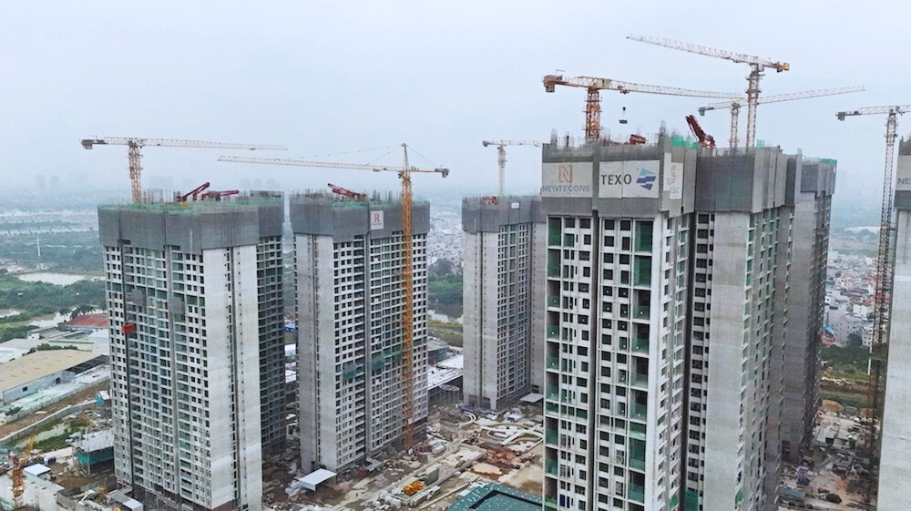 Ghi nhận thực tế cho thấy, tầng hầm của cả ba phân khu đã hoàn thiện, phần thân nhiều tòa đang thi công tới tầng 29-31 và chuẩn bị cất nóc.