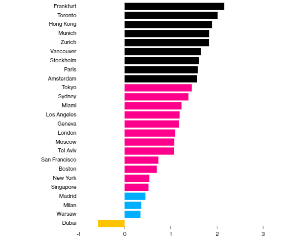 Không giống như cuộc khủng hoảng tài chính toàn cầu năm 2008, các thành phố của Mỹ nằm ngoài vùng nguy hiểm. Moscow và Stockholm có mức tăng rủi ro lớn nhất, trong khi Tokyo và Sydney cũng thăng hạng rủi ro khi thị trường nhà ở bùng nổ.