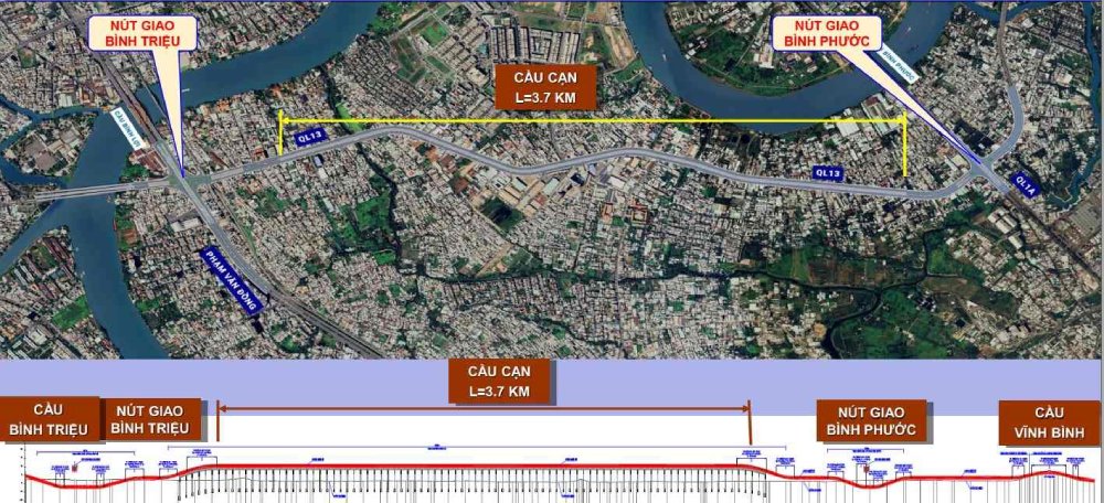 Theo kế hoạch, đoạn tuyến Quốc lộ 13 này sẽ được mở rộng lên 60m với 10 làn xe. Trên tuyến sẽ xây dựng cầu cạn dài 3,2km, kéo dài từ nút giao Bình Triệu đến nút giao Bình Phước với quy mô 4 làn xe, tốc độ 80km/h. Phía dưới, đường song hành hai bên rộng 3 làn xe, tốc độ tối đa 60km/h, phục vụ xe hỗn hợp. Tại các nút giao quan trọng như cầu Bình Lợi và nút giao Bình Phước, dự án sẽ bổ sung hầm chui 2 chiều để tăng khả năng lưu thông.