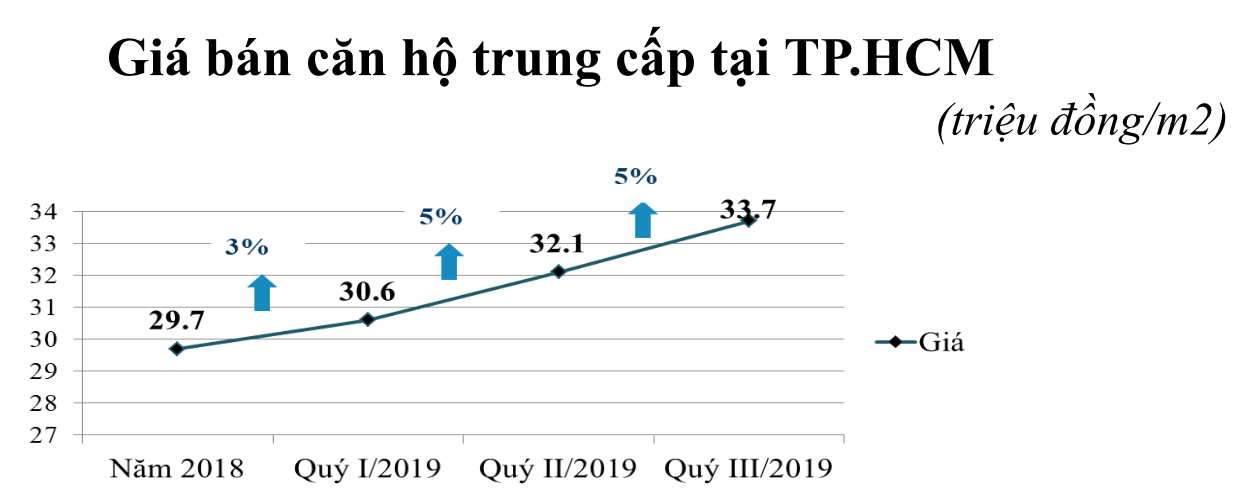 Về giá bán, căn hộ trung cấp tại TP.HCM thời gian qua luôn trong tình trạng leo thang, từ mốc 29,7 triệu đồng/m2 năm 2018 lên đến 33,7 triệu đồng/m2 quý III/ 2019. Riêng trong quý III/2019, giá nhà trung cấp tăng khoảng 5% so với quý II/2019.