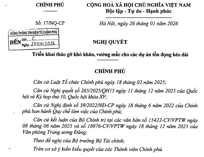 Theo Nghị quyết, Chính phủ yêu cầu các bộ, ngành và địa phương khẩn trương rà soát, tổng hợp và triển khai các giải pháp cụ thể để xử lý khó khăn, vướng mắc của từng dự án, không để tình trạng đình trệ tiếp tục kéo dài. Việc tháo gỡ phải bảo đảm đúng thẩm quyền, minh bạch, không hợp thức hóa sai phạm và không phát sinh vi phạm mới trong quá trình xử lý.
