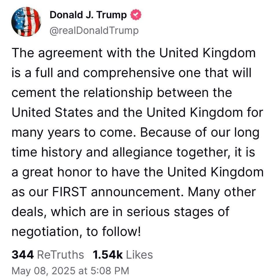 Trong một bài đăng trên mạng xã hội Truth Social, Tổng thống Mỹ Donald Trump cho biết: “Thỏa thuận với Anh là một thỏa thuận đầy đủ và toàn diện, sẽ củng cố mối quan hệ giữa Mỹ và Anh trong nhiều năm tới. Với lịch sử gắn bó và mối quan hệ đồng minh lâu dài, việc Anh trở thành quốc gia đầu tiên được công bố là một vinh dự lớn. Nhiều thỏa thuận khác - hiện đang trong giai đoạn đàm phán nghiêm túc - sẽ sớm được công bố!”.