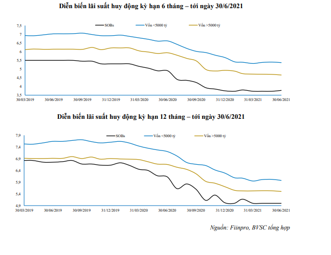 Như vậy, lãi suất trung bình 6 tháng và 12 tháng theo thống kê của BVSC trong tháng 6/2021 cùng tiếp tục giảm 17- 20% so với mặt bằng cùng kỳ năm trước.