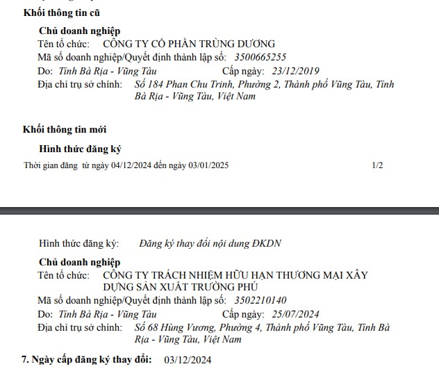 Tuy nhiên, ngày 3/12/2024, tức ngay sau ngày huy động thành công lô hơn 1.700 tỷ đồng, chủ doanh nghiệp này đã chuyển đổi thành Công ty TNHH Thương mại Xây dựng sản xuất Trường Phú. Trường Phú mới chỉ được thành lập hồi tháng 7/2024.