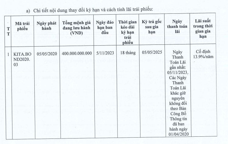 Trước đó, vào tháng 5, Kita Invest đã có một lần thay đổi kỳ hạn, khi đó với dư nợ còn 500 tỷ đồng, công ty dời ngày đáo hạn để trả gốc từ 5/5 sang 5/11/2023.