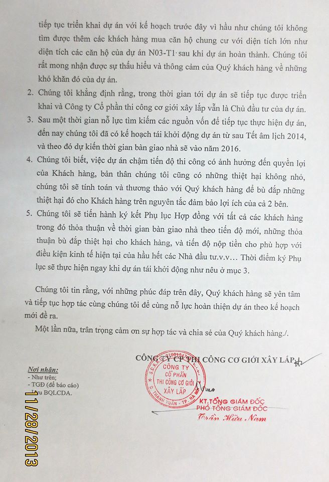Công văn do ông Trần Hữu Nam, Phó Tổng giám đốc Công ty cổ phần cơ giới xây lắp cũng hứa hẹn: “Chúng tôi đã có kế hoạch tái khởi động từ sau tết âm lịch 2014 và theo đó dự kiến thời gian ban giao nhà sẽ vào năm 2006”.