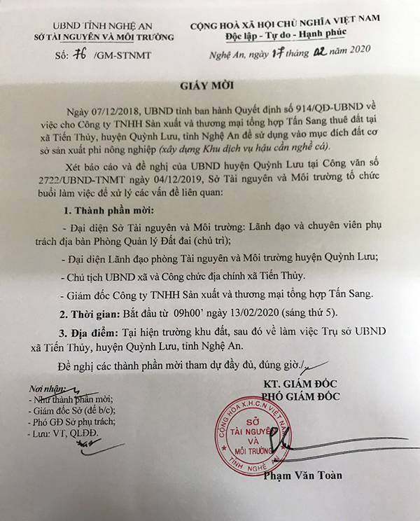Theo đó, vào ngày 07/02/2020, ông Phan Văn Toàn – Phó giám đốc Sở TN&MT tỉnh Nghệ An đã ký giấy mời số 76 về việc tổ chức buổi làm việc để xử lý các vấn đề liên quan.