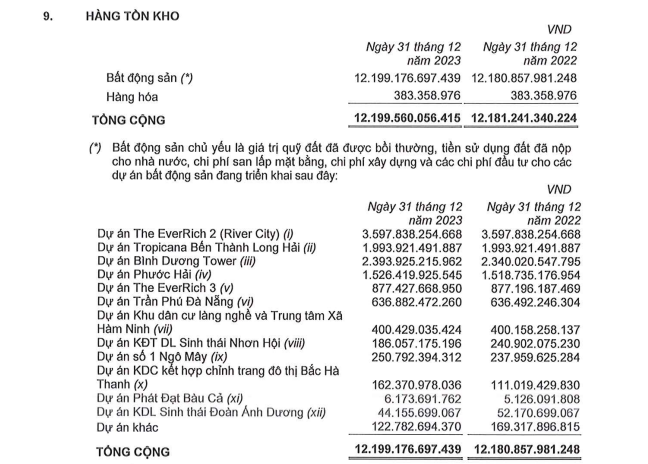 Chiếm tỷ trọng lớn nhất trong tổng tài sản là hàng tồn kho với gần 12.200 tỷ đồng. Trong đó, phần lớn là tồn kho tại các dự án bất động sản như The EverRich 2 (3.598 tỷ đồng), Bình Dương Tower (2.394 tỷ đồng), Phước Hải (1.526 tỷ đồng), Tropicana Bến Thành Long Hải (1.994 tỷ đồng)...