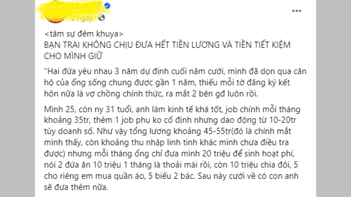 Như vậy tổng lương khoảng 45-55 triệu đồng (đó là chính mắt mình thấy, còn khoản thu nhập linh tinh khác mình chưa điều tra được) nhưng mỗi tháng ổng chỉ đưa mình 20 triệu để sinh hoạt phí, nói hai đứa ăn 10 triệu 1 tháng là thoải mái rồi, còn 10 triệu chia đôi, 5 triệu cho riêng em mua quần áo, 5 triệu biếu hai bác. Sau này cưới về có con anh sẽ đưa thêm nữa” – cô gái chia sẻ.