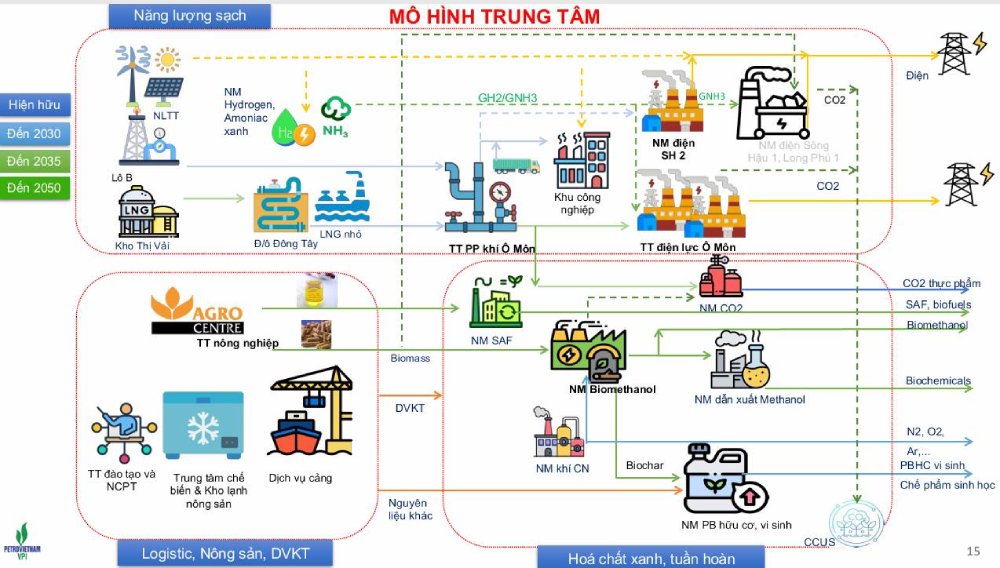 Theo Petrovietnam, mô hình trung tâm công nghiệp năng lượng sinh thái tại Cần Thơ tích hợp 3 cụm chức năng cộng sinh, gồm: cụm năng lượng sạch, cụm công nghiệp phân bón, hóa chất xanh và cụm nông sản, logistics, dịch vụ kỹ thuật, cảng chuyên dụng, trung tâm nghiên cứu - đào tạo nhân lực cùng khu đô thị sinh thái...