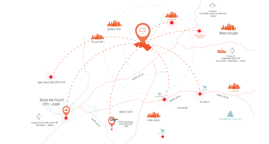 Từ khu công nghiệp Phú Xuân, chỉ mất khoảng 20km để di chuyển đến sân bay Buôn Ma Thuột và 25km để vào trung tâm thành phố.