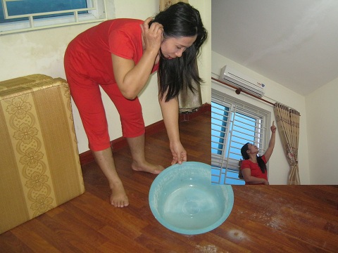 Chị Phạm Thị Thương mua nhà cho con trên tầng 11 cho biết, nhà đã dọn về ở gần 2 năm. Chỉ sau mấy tháng chị chuyển đến sinh sống, xảy ra tình trạng trần bị nứt, ngấm nước. Chị đã gọi BQL tòa nhà đến xử lý, thậm chí bỏ tiền túi ra để mua vật liệu tốt nhưng tình trạng nứt và dột vẫn tái diễn mỗi khi mưa xuống. Mỗi lần như thế đều phải dùng chậu để hứng nước.
