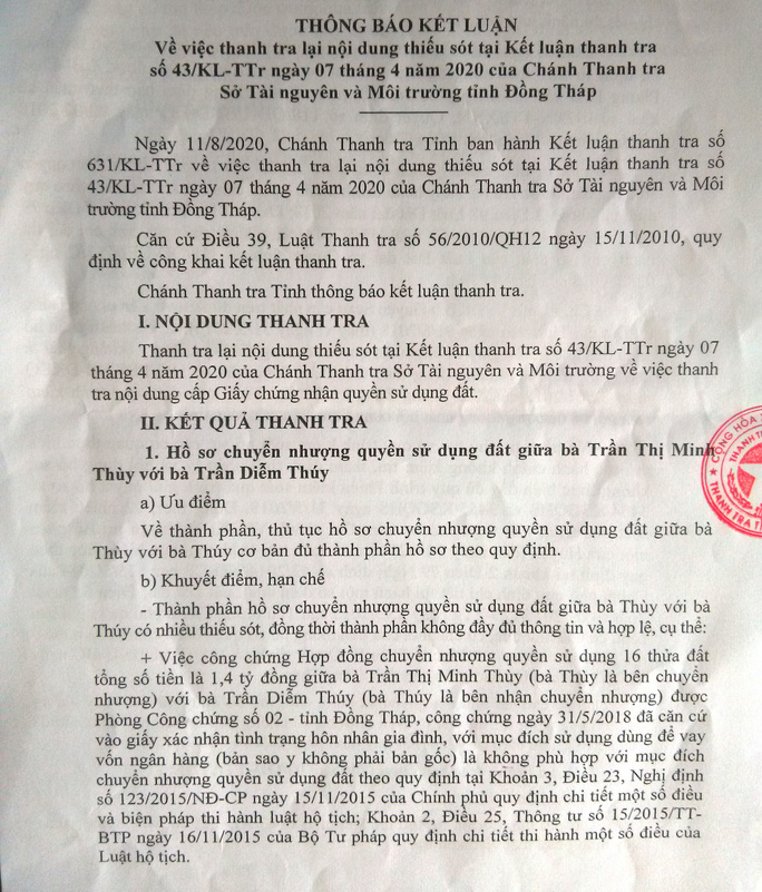 Đến 7-4-2020, Thanh trả Sở TN-MT đã có kết luận, trong đó kết luận việc chuyển nhượng 16 thửa đất từ bà Thùy sang người em ruột là nhanh bất thường nhưng quy trình, thủ tục là đúng. Tuy nhiên, vụ việc có nhiều "uẩn khúc", nên Chủ tịch UBND tỉnh Đồng Tháp tiếp tục chỉ đạo Thanh tra tỉnh vào cuộc thanh tra.