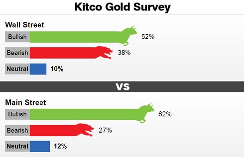 Có tới 62% nhà đầu tư tham gia khảo sát trực tuyến trên Main Street bày tỏ lạc quan về đà tăng của giá vàng tuần tới. 27% dự đoán giá vàng sẽ đi ngang, chỉ 12% bi quan về giá kim loại quý này trong tuần sau.