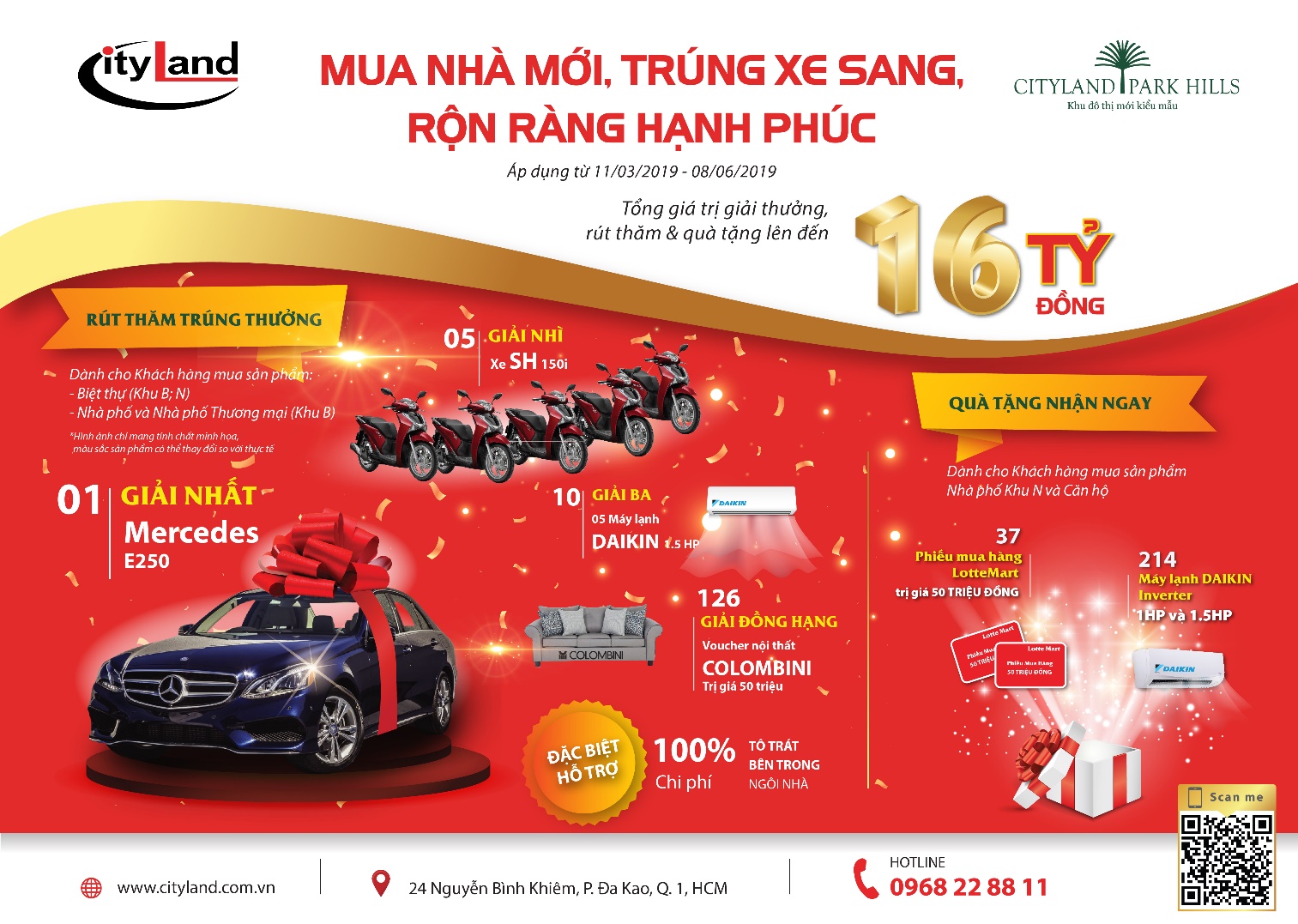 | Thông tin chi tiết chương trình "Mua nhà mới, trúng xe sang, rộn ràng hạnh phúc": Công ty TNHH Đầu tư Địa ốc Thành phố - CityLand Hotline: 0968228811 Website: https://cityland.com.vn/mua-nha-moi-trung-xe-sang-ron-rang-hanh-phuc/ |