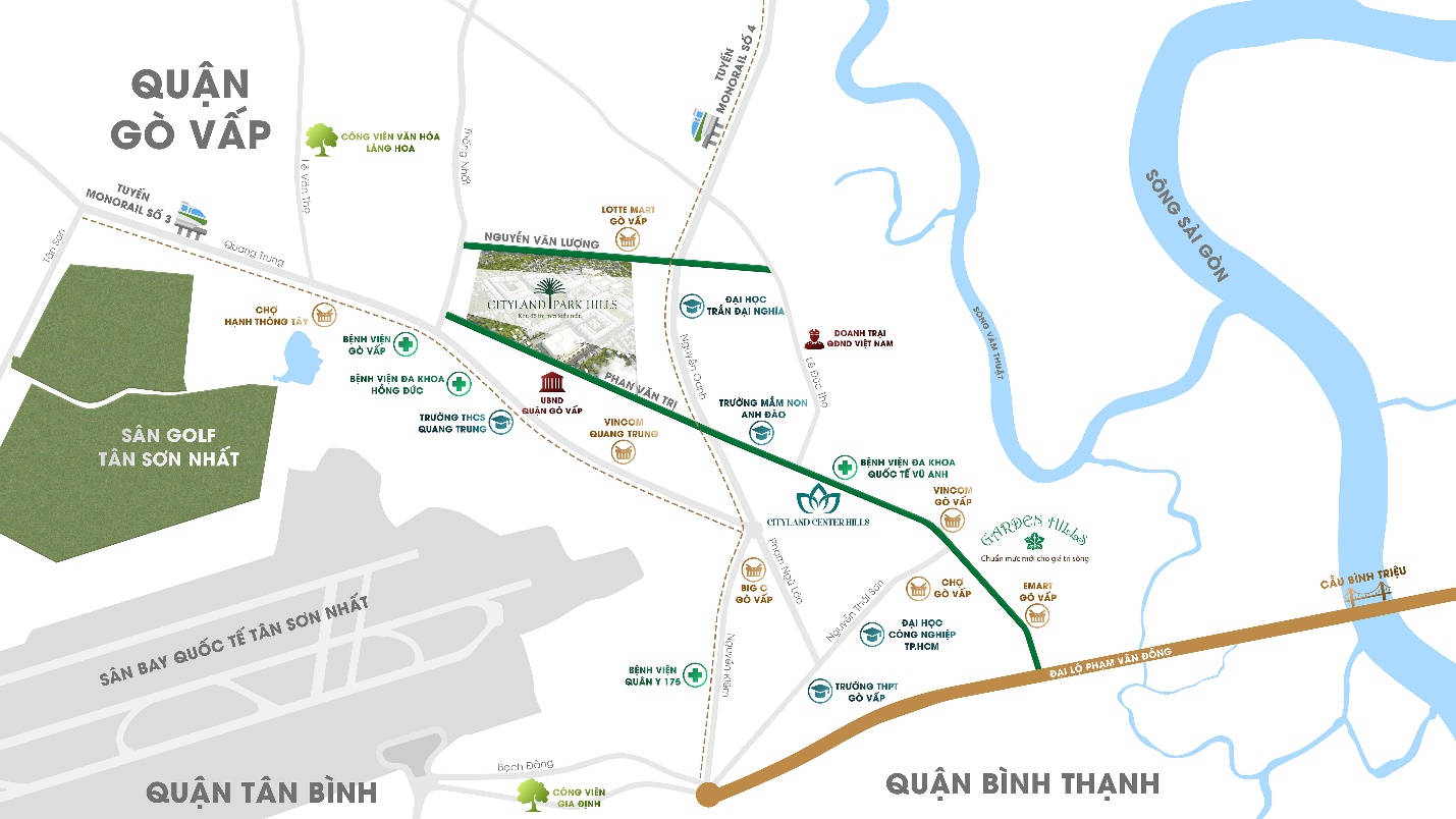 Với vị trí gần kề sân bay, sở hữu hai mặt tiền đường Phan Văn Trị và Nguyễn Văn Lượng, từ Cityland Park Hills cư dân chỉ mất khoảng 10 phút để bệnh viện 175, sân bay quốc tế Tân Sơn Nhất hoặc trung tâm Q.1 khoảng 20 phút.