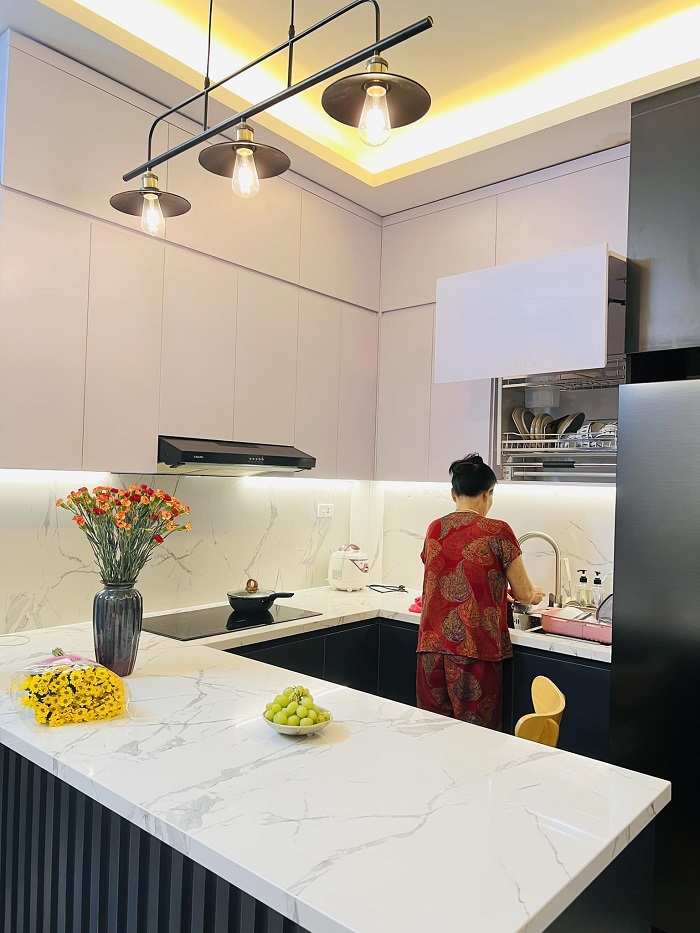 “Từ lúc bắt đầu nhận nhà là những ngày mình phải chịu khá nhiều áp lực khi một lúc phải sắp xếp nhiều công việc. Buổi chiều làm việc tại công ty, tối qua quán ăn, khi quán đóng cửa thì chạy nhanh về nhà để xem tình hình căn nhà đã được sửa sang đến đâu. Đầu mình lúc nào cũng căng thẳng khi phải tự mình lựa chọn mọi thứ từ sàn, cửa, gạch, sơn, nội thất, rồi đến những thứ đơn giản nhất bát đũa, nồi niêu và vô số các thiết bị gia dụng khác. Có những khoản tiền lớn như tủ bếp, tủ quần áo, giường, ghế sofa… mình không có đủ tiền chi trả phải vay mượn thêm. Cuối cùng sau một năm căn hộ cũng hoàn thành với tổng chi phí 800 triệu đồng. Trong đó, mình vay ngân hàng 500 triệu đồng” – Hải Ninh cho biết.