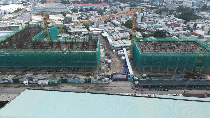 Ghi nhận tiến độ, hiện cả hai tòa tháp của dự án đang được chủ đầu tư đẩy nhanh thi công. Trên công trường xuất hiện nhiều công nhân cùng phương tiện máy móc.