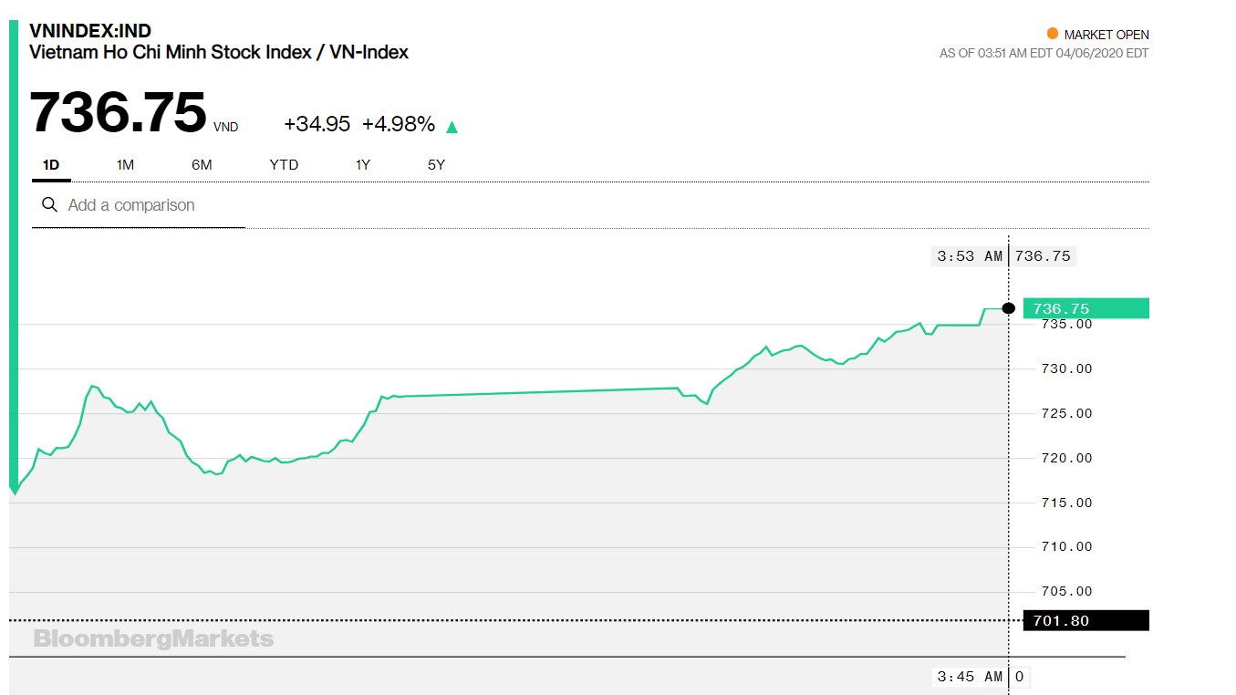 Kết thúc phiên giao dịch đầu tuần của ngày hôm qua, VN-Index tăng 34,95 điểm để chạm đến 736,75 điểm, ứng với mức tăng 4,98%. Có tất cả 95 mã tăng trần trong tổng số 330 mã tăng, bên cạnh 59 mã giảm và 42 mã đứng giá. Đây là phiên tăng điểm mạnh nhất của VN-Index trong vòng 19 năm qua kể từ ngày 8/10/2001 (mức tăng 6,88% tại thời điểm đó).