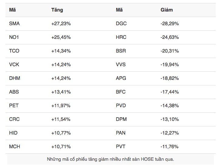 Những mã tăng cao nhất sàn HOSE tuần qua chủ yếu là cổ phiếu vốn hoá nhỏ, giá trị thấp như SMA (+27,23%), NO1 (+25,45%), TCO (+14,34%), DHM (+14,24%) và ABS (+13,41%)…