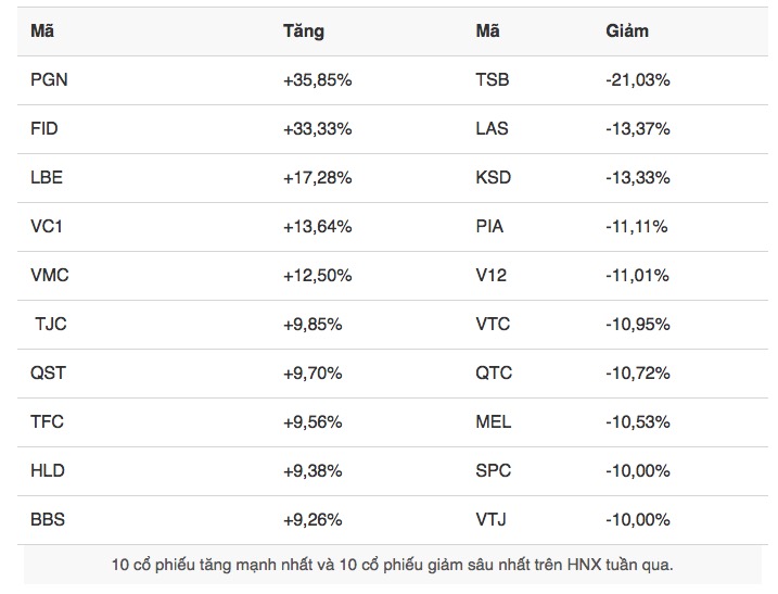 Ở chiều tăng, PGN (+35,85%) và FID (+33,33%) là hai mã nổi bật nhất, tiếp theo là các cổ phiếu như LBE, VC1, VMC.