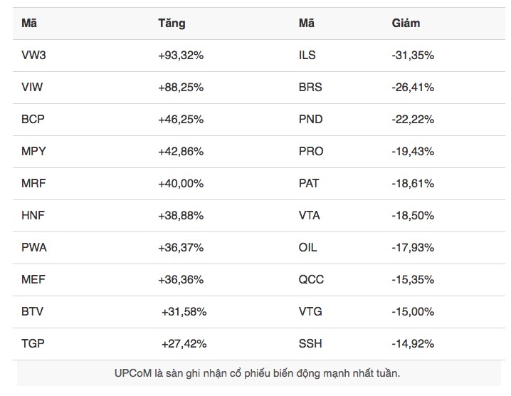 Trên sàn UPCOM, cổ phiếu VW3 tăng mạnh nhất khi đạt 93,32%, theo sau là VIW tăng 88,25%. Trong đó, VW3 là công ty con do VIW nắm hơn 54% vốn.