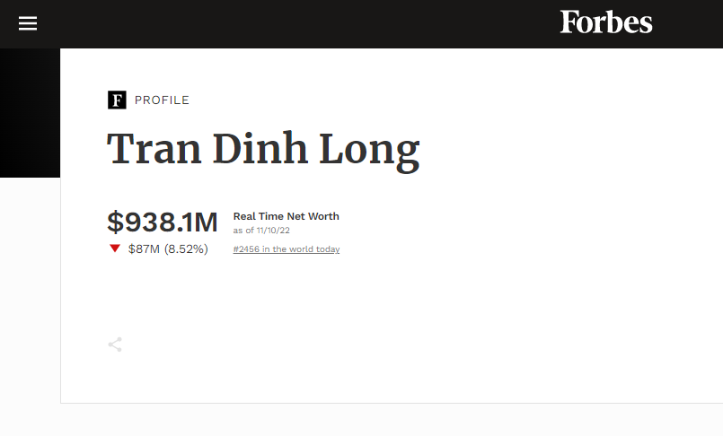 Chỉ trong gần 8 tháng kể từ ngày 11/3, tài sản của ông Trần Đình Long đã bốc hơi hơn 2,2 tỷ USD, tương đương mức giảm ròng 70%. Như vậy, ông Long không còn nằm trong danh sách tỷ phú USD của Forbes.