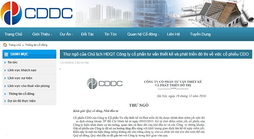 Cuối ngày 19/12, Chủ tịch Hội đồng quản trị Vũ Đình Nhân đã gửi thư ngỏ tới cổ đông về vấn đề cổ phiếu liên tục mất giá. Trong thư, ông Nhân cho biết, trên thị trường xuất hiện rất nhiều tin đồn xấu liên quan đến cổ phiếu CDO, cùng với việc các công ty chứng khoán hạ tỷ lệ margin đã khiến cổ phiếu giảm sàn nhiều phiên liên tiếp. Điều này đã ảnh hưởng lớn đến hình ảnh của công ty cũng như lợi ích của các cổ đông.