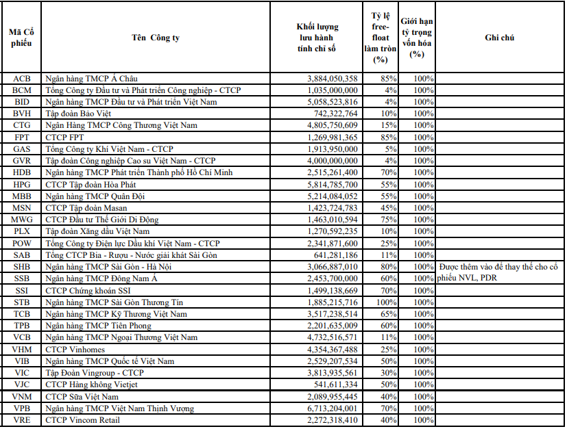Danh mục thành phần chỉ số VN30 kỳ tháng 7/2023. Nguồn: HoSE