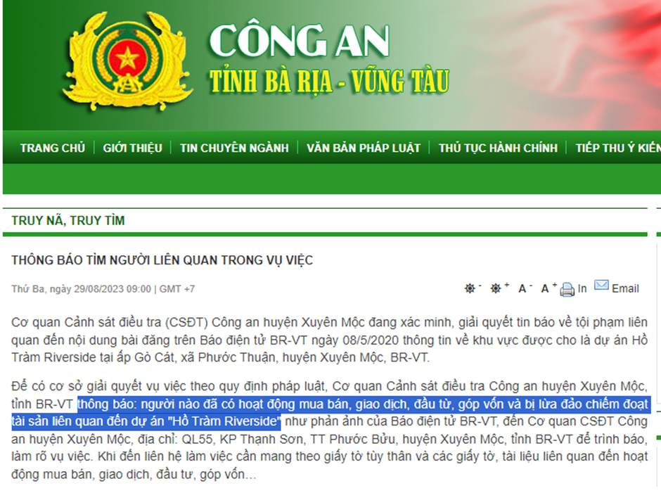 Để có cơ sở giải quyết vụ việc theo quy định pháp luật, Cơ quan Cảnh sát điều tra Công an huyện Xuyên Mộc thông báo: người nào đã có hoạt động mua bán, giao dịch, đầu tư, góp vốn và bị lừa đảo chiếm đoạt tài sản liên quan đến dự án "Hồ Tràm Riverside" như phản ảnh của Báo điện tử Bà Rịa - Vũng Tàu, đến Cơ quan CSĐT Công an huyện Xuyên Mộc, địa chỉ: QL55, KP Thạnh Sơn, TT Phước Bửu, huyện Xuyên Mộc, tỉnh BR-VT để trình báo, làm rõ vụ việc. Khi đến liên hệ làm việc cần mang theo giấy tờ tùy thân và các giấy tờ, tài liệu liên quan đến hoạt động mua bán, giao dịch, đầu tư, góp vốn…