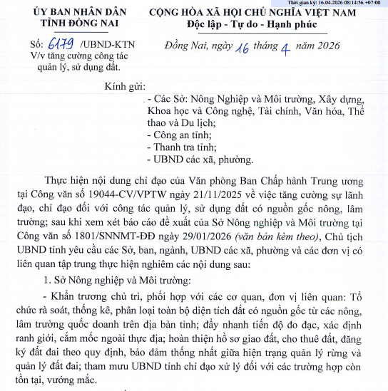 UBND tỉnh UBND tỉnh Đồng Nai vừa có văn bản chỉ đạo rà soát, chấn chỉnh toàn diện công tác quản lý và sử dụng các khu đất, thửa đất công trên địa bàn tỉnh, trong bối cảnh hàng loạt tồn tại, vi phạm liên quan đến đất công được cơ quan công an chỉ ra, tiềm ẩn nguy cơ gây mất an ninh, trật tự và lãng phí nghiêm trọng nguồn lực đất đai.