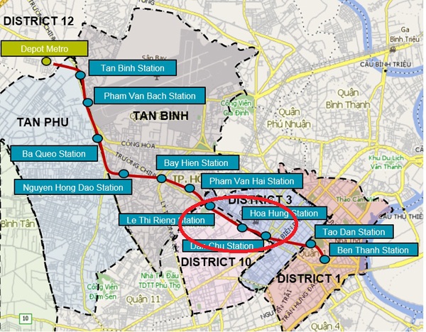 Trước đó, UBND Thành phố cũng công bố hệ số điều chỉnh giá đất để tính bồi thường, hỗ trợ rên địa bàn quận 10 gồm: Gần vòng xoay Công trường Dân chủ, đoạn từ Lê Hồng Phong đến Ngã Sáu Công trường Dân chủ) có hệ số là 4,62; Mặt tiền đường Cách mạng Tháng Tám, phường 12, quận 10 (đoạn gần vòng xoay Công trường Dân chủ) có hệ số là 4,16; Khu vực ga Hòa Hưng - S4, mặt tiền đường Cách mạng Tháng Tám, phường 13, quận 10 hệ số là 3,995; Hẻm 463 CMT8, phường 13, quận 10( Hẻm Vị trí 3) hệ số 4,0; Hẻm 499 CMT8, phường 13, quận 10 ( Hẻm Vị trí 3) hệ số là 4,0; Hẻm 493 CMT 8, phường 13, quận 10 (Hẻm Vị trí 3) hệ số là 4,0; Hẻm 493 CMT 8, phường 13, quận 10 (Hẻm Vị trí 4- Hẻm đi vào nhà số 499/2 Bis) hệ số là 3,06; Khu vực ga Lê Thị Riêng – S5, đường CMT8, phường 15, quận 10 hệ số là 3,995.