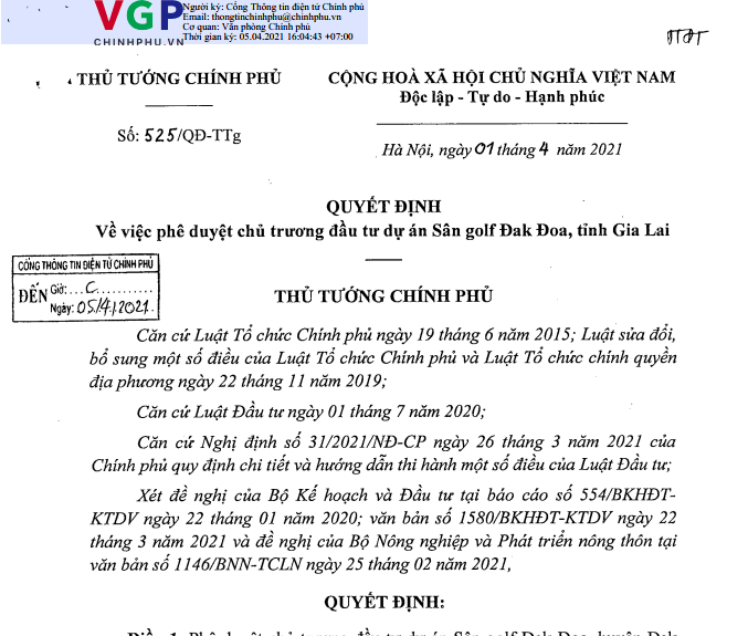 Kết luận vụ việc, Cổng thông tin điện tử Chính phủ cho biết, việc ký quyết định phê duyệt chủ trương đầu tư dự án sân golf Đak Đoa là thận trọng, chặt chẽ, đúng thẩm quyền, đúng quy định pháp luật, nhằm phát triển kinh tế - xã hội của Gia Lai, một tỉnh còn nhiều khó khăn và tính toán kỹ đến yếu tố bảo vệ môi trường, cảnh quan.
