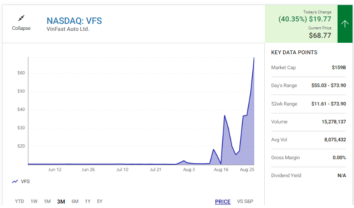 Cổ phiếu VFS của VinFast đã tăng lên đến 69 USD/cổ phiếu từ mức ban đầu 22 USD/cổ phiếu chốt phiên 25/8/2023 tại thị trường chứng khoán Mỹ, đưa giá trị thị trường của công ty lên đến 159 tỷ USD, trở thành cộng ty có giá trị lớn nhất Việt Nam tính tới thời điểm hiện tại.