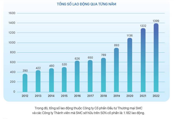 Tính tới ngày 31/12/2022, tổng số lượng nhân sự của SMC là 1399 lao động, tăng 67 nhân sự, tương ứng tăng 5% so với năm 2021.