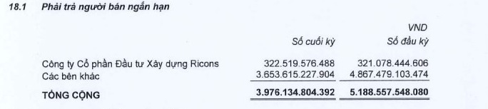 Mặt khác, trong cơ cấu nợ ngắn hạn, phải trả người bán ngắn hạn chiếm hơn 3,976 tỷ đồng. Trong đó, khoản phải trả của Coteccons đối với Ricons là 322.5 tỷ đồng, tăng nhẹ so với đầu năm. Khoản phải trả này bằng 8% tổng số dư phải trả người bán ngắn hạn của công ty và chiếm 1,6% quy mô tổng tài sản ở thời điểm 31/03.