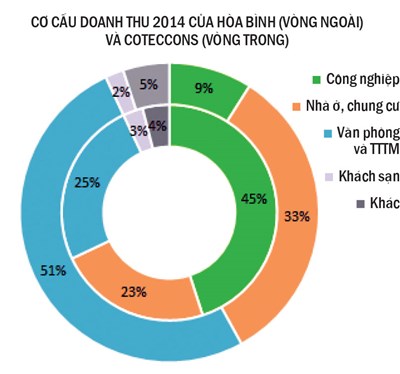 Nhìn vào cơ cấu doanh thu của công ty mẹ (Coteccons có những công ty con như Unicons, Phú Hưng Gia...) trong năm 2014 có thể thấy mảng công nghiệp đang chiếm tỷ trọng lớn, với 38%, tiếp theo là mảng thương mại - văn phòng (32%), chung cư chiếm 25% và 4% là khách sạn - resort (1% còn lại là các khoản doanh thu khác).
