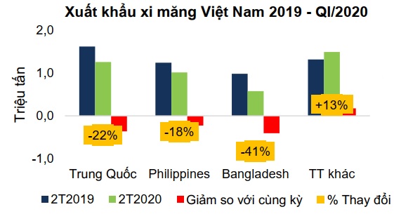 Theo số liệu thống kê những tháng đầu năm 2020, lượng xuất khẩu xi măng sang thị trường Trung Quốc đã giảm 22%, sang Phillippines giảm 18%, xuất khẩu sang Bangladesh giảm 41% so với cùng kỳ năm 2019. Theo số liệu mới nhất của Tổng cục Hải quan, lũy kế 4 tháng đầu năm, lượng xuất khẩu xi măng đạt hơn 10,5 triệu tấn, trị giá gần 395 triệu USD giảm 7,1% về lượng và giảm 17,9% về trị giá so với cùng kỳ.