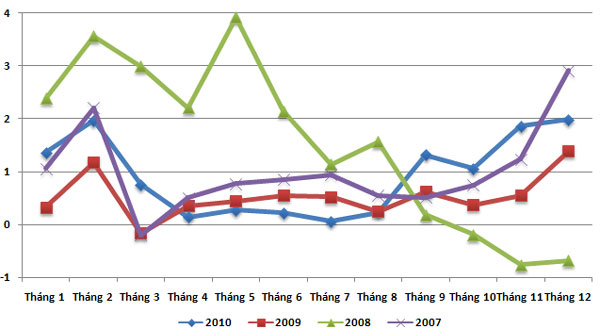 Biểu đồ CPI qua các tháng năm 2007-2010. Nguồn: GSO, NDHMoney