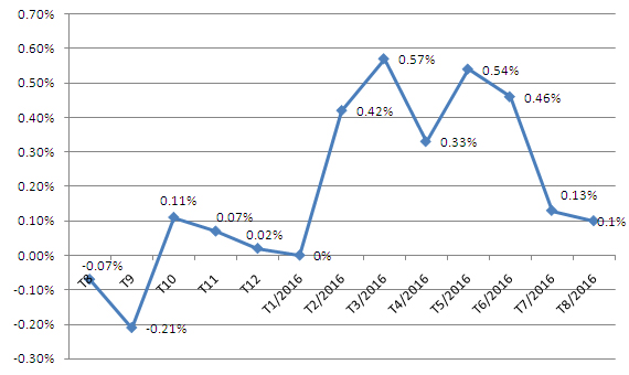 Lạm phát cơ bản tháng 8/2016 tăng 0,09% so với tháng trước, tăng 1,83% so với cùng kỳ. 8 tháng đầu năm 2016 so cùng kỳ năm 2015, lạm phát cơ bản ở mức 1,81%.