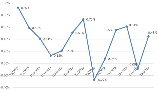 Lạm phát cơ bản tháng 8/2018 tăng 0,22% so với tháng trước và tăng 1,54% so với cùng kỳ năm trước. Lạm phát cơ bản bình quân 8 tháng năm 2018 tăng 1,38% so với bình quân cùng kỳ năm 2017.