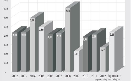 CPI tháng 2 từ năm 2002 đến 2012 (%).